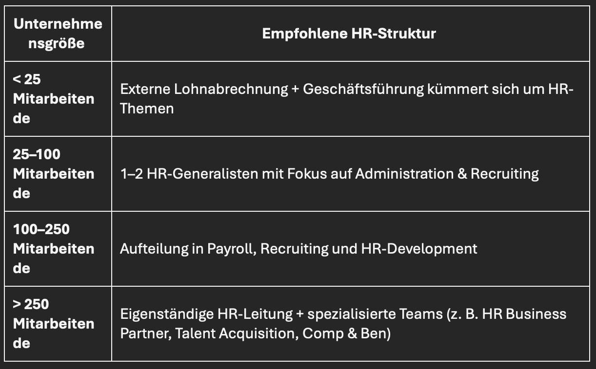 Ab etwa 100 Beschäftigten sollte die HR-Struktur klar definiert sein, idealerweise mit Spezialisierungen in: